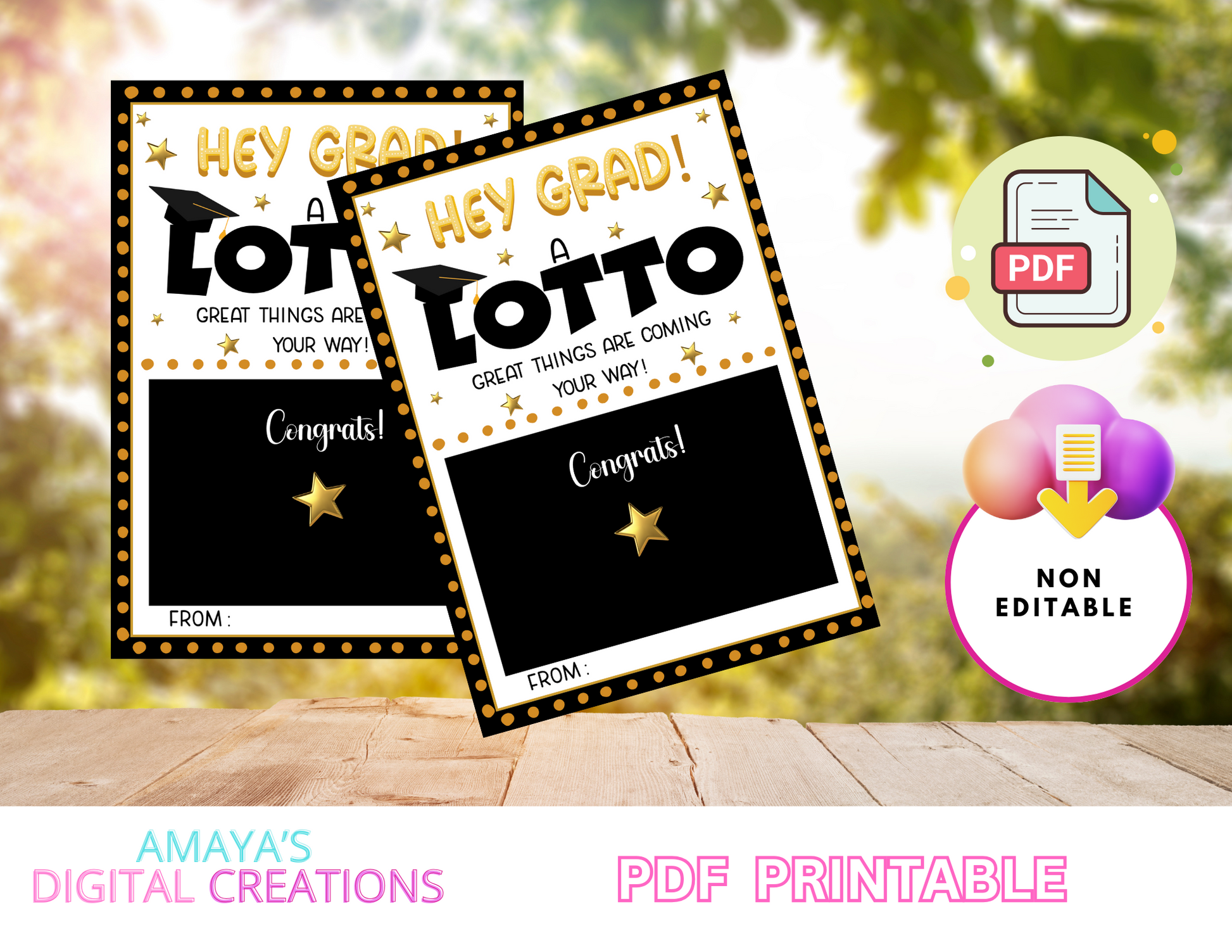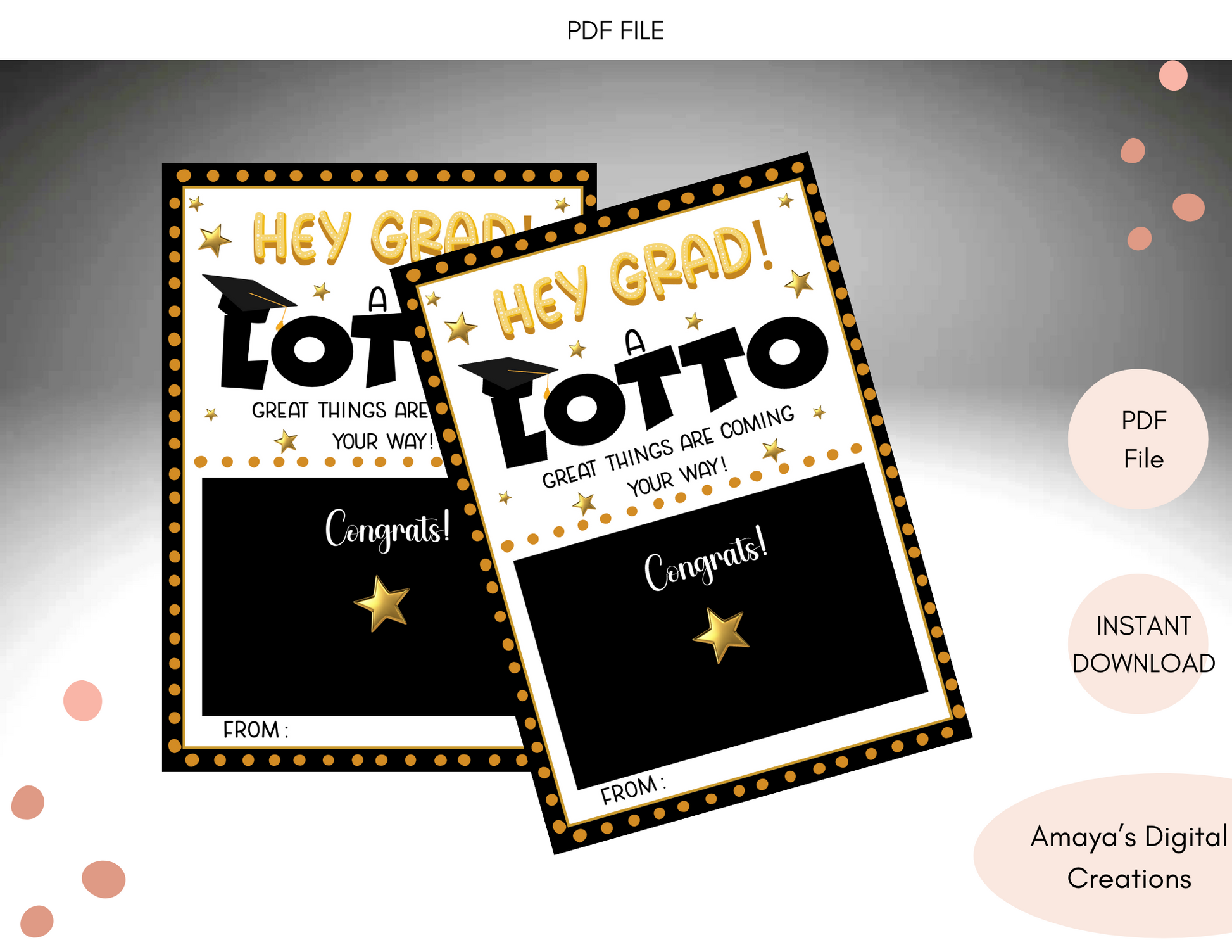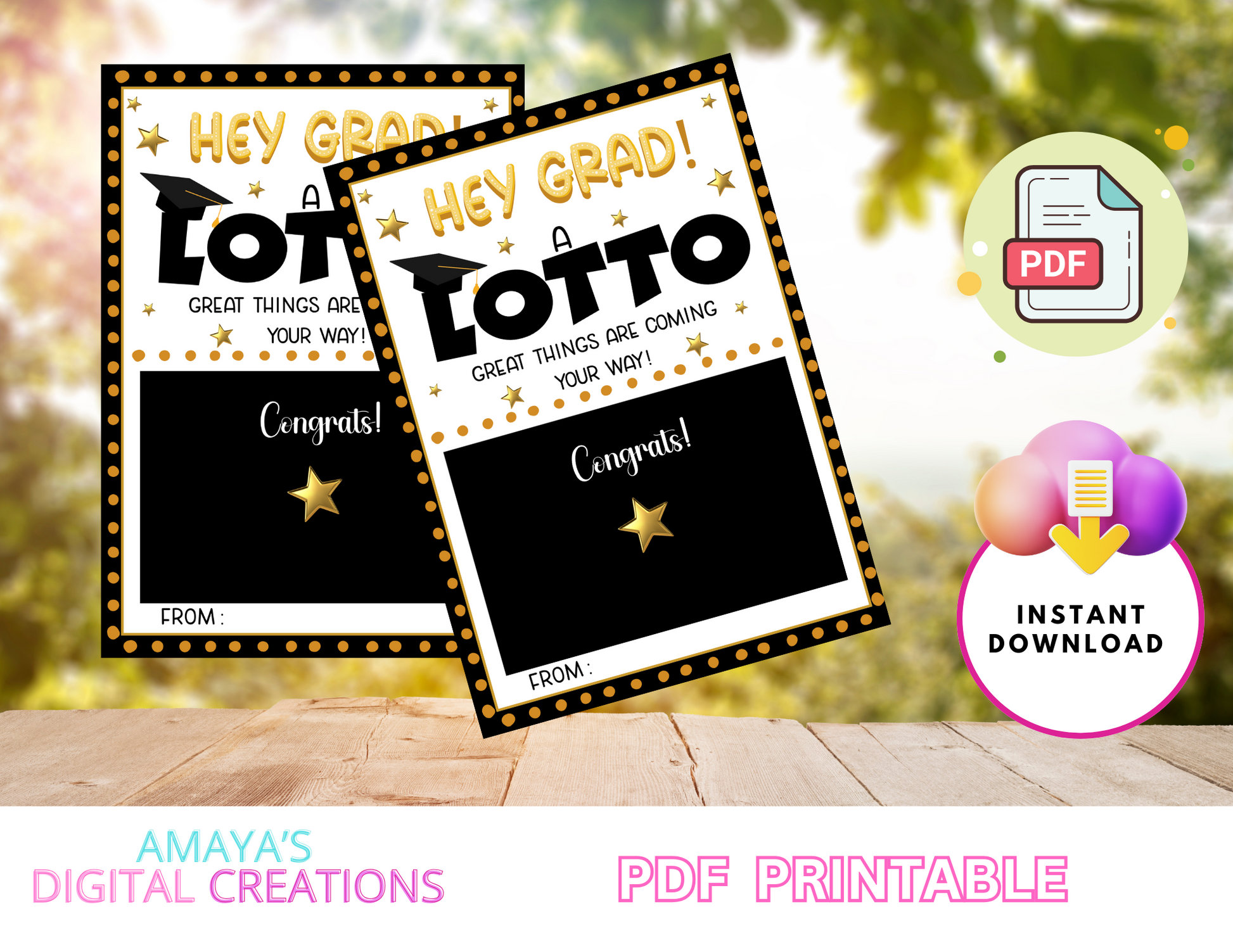 Celebrate your favorite grad with a fun and easy DIY gift! This instant download printable tag is perfect for holding a scratch-off lotto ticket and sending a little extra luck their way. Features a festive message: