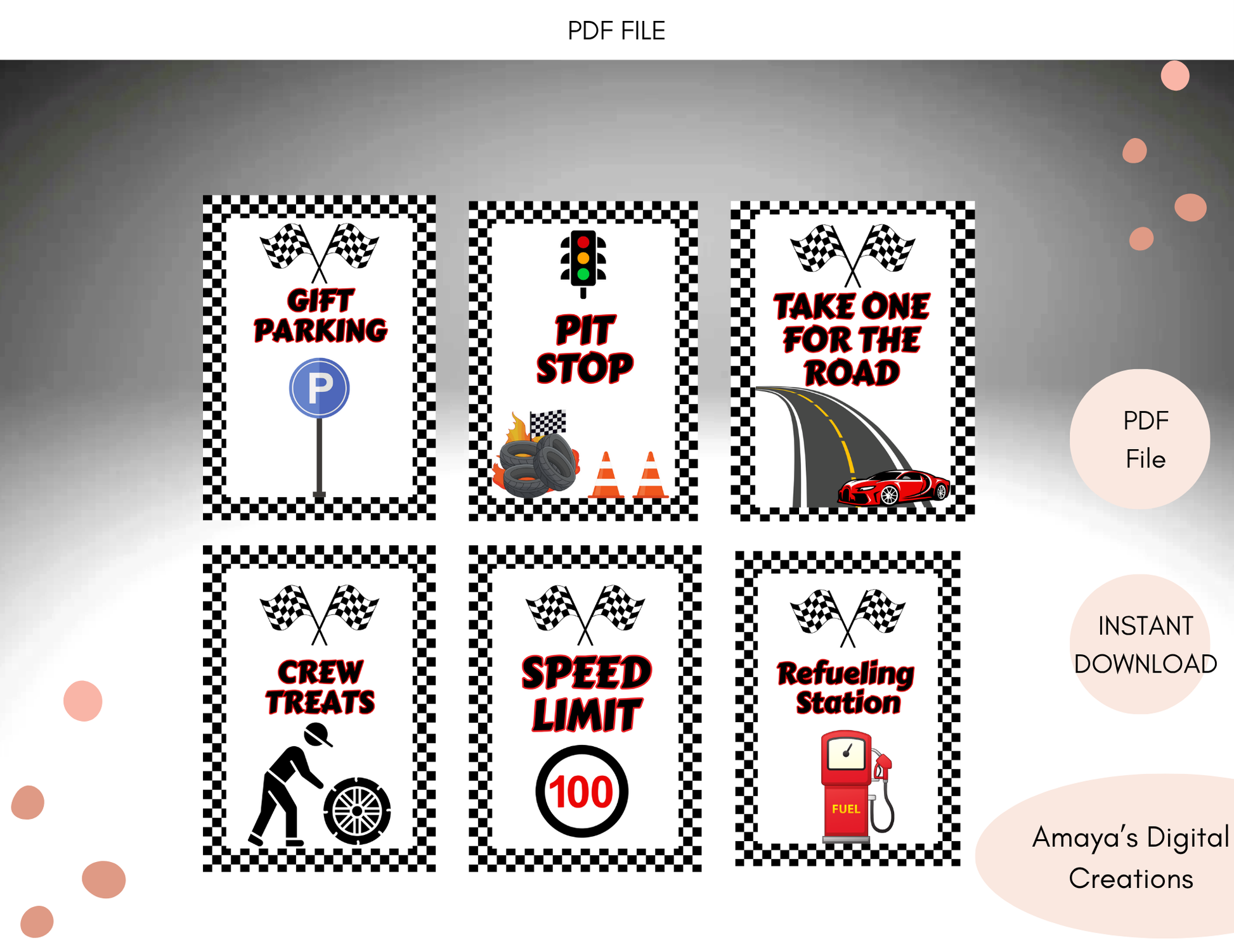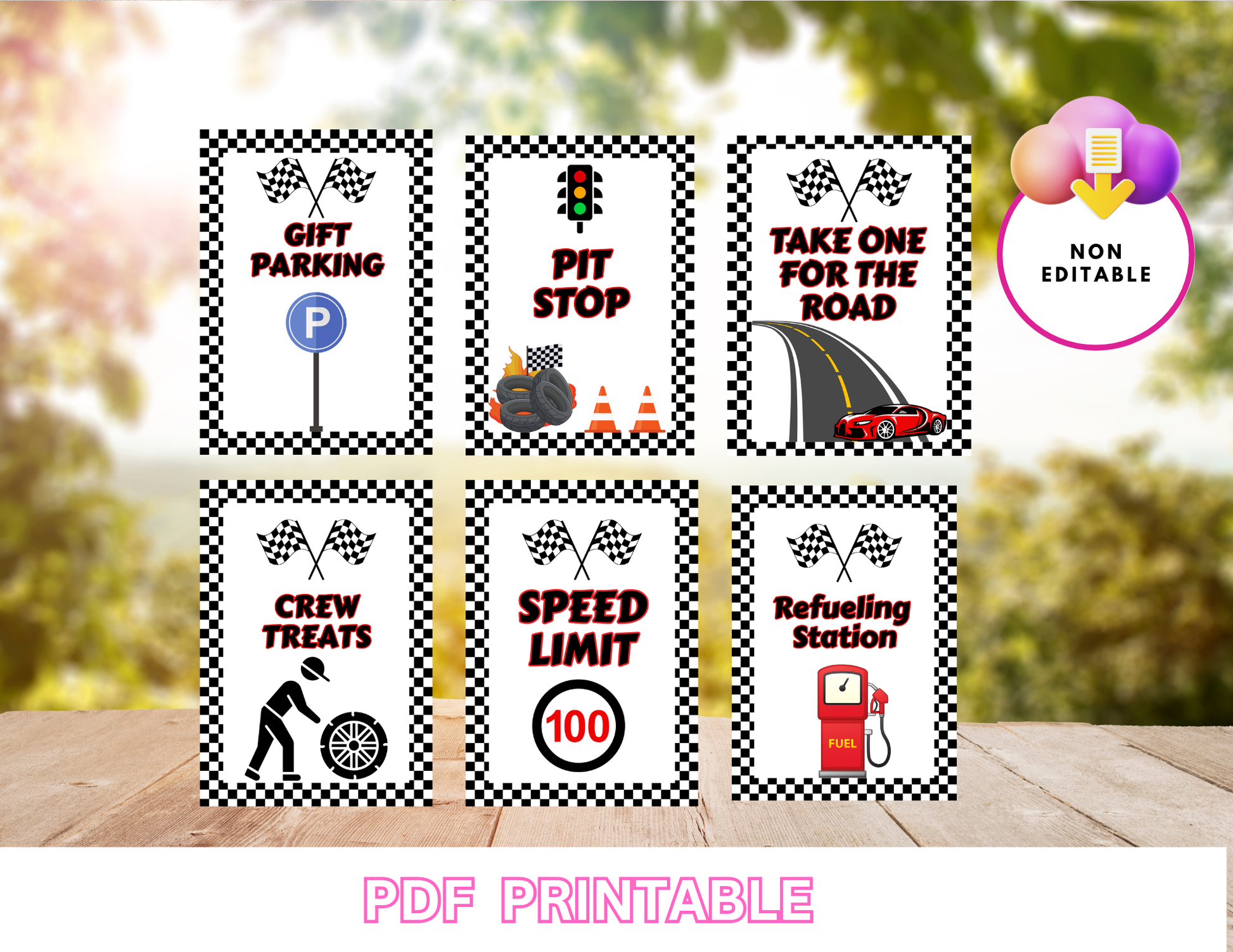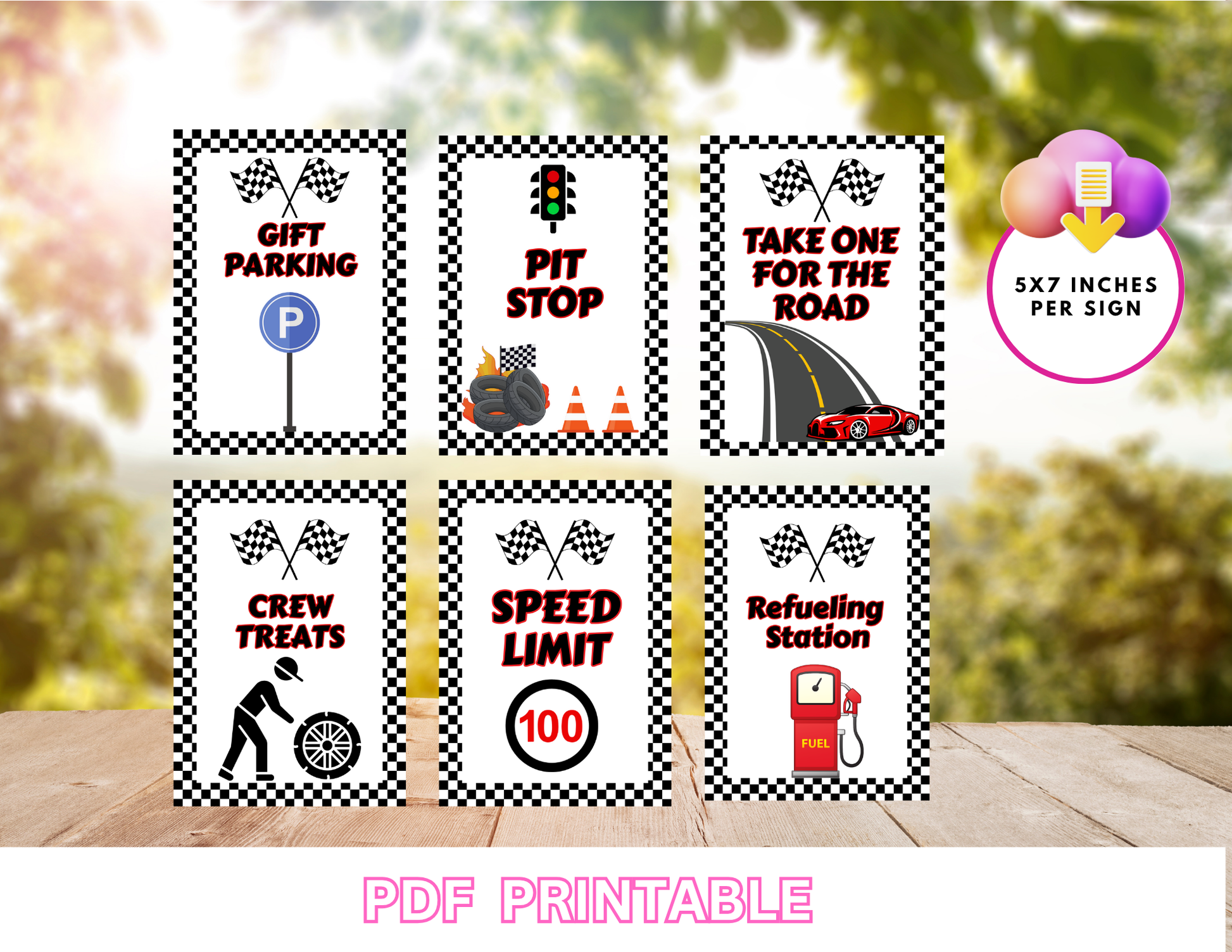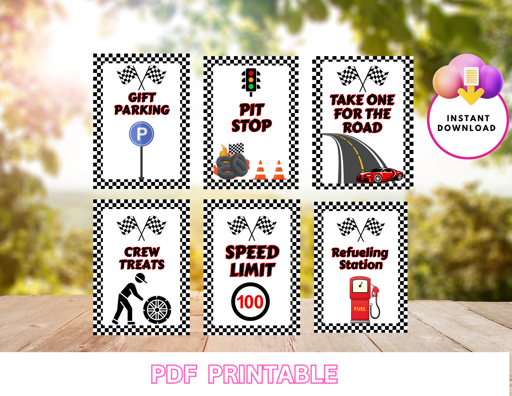 Race Car Birthday Printable Signs – Set of 6 PDF Prints Non-Editable Instant PDF Download